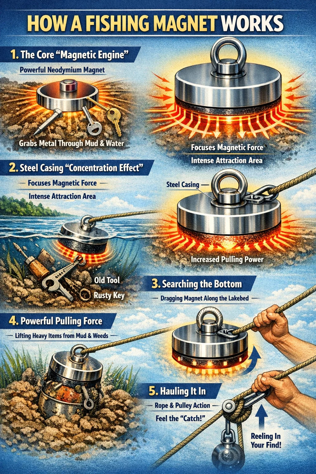 To understand how a fishing magnet works, you can imagine it as a super-powered "underwater vacuum cleaner," except instead of dust, it sucks up metal.