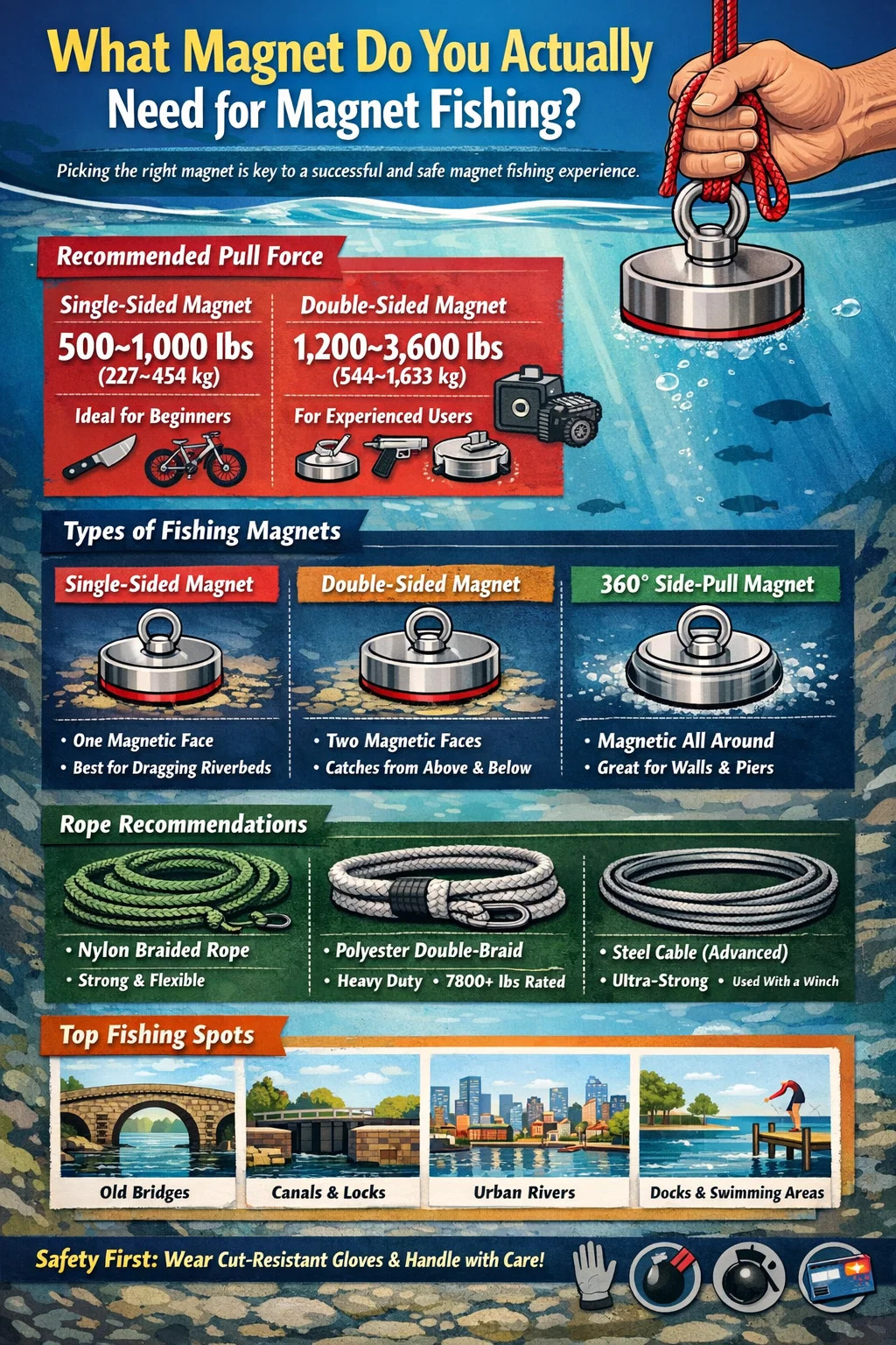 The short answer: for most beginners, a single-sided neodymium magnet with 500–1,000 lbs (227–454 kg) of pull force is the ideal starting point for magnet fishing. It is strong enough to retrieve knives, tools, bikes, and even safes from rivers and lakes, yet manageable enough to handle safely without specialized equipment. If you are more experienced or targeting heavier objects in deep water, a double-sided magnet in the 1,200–3,600 lb range becomes the better choice.