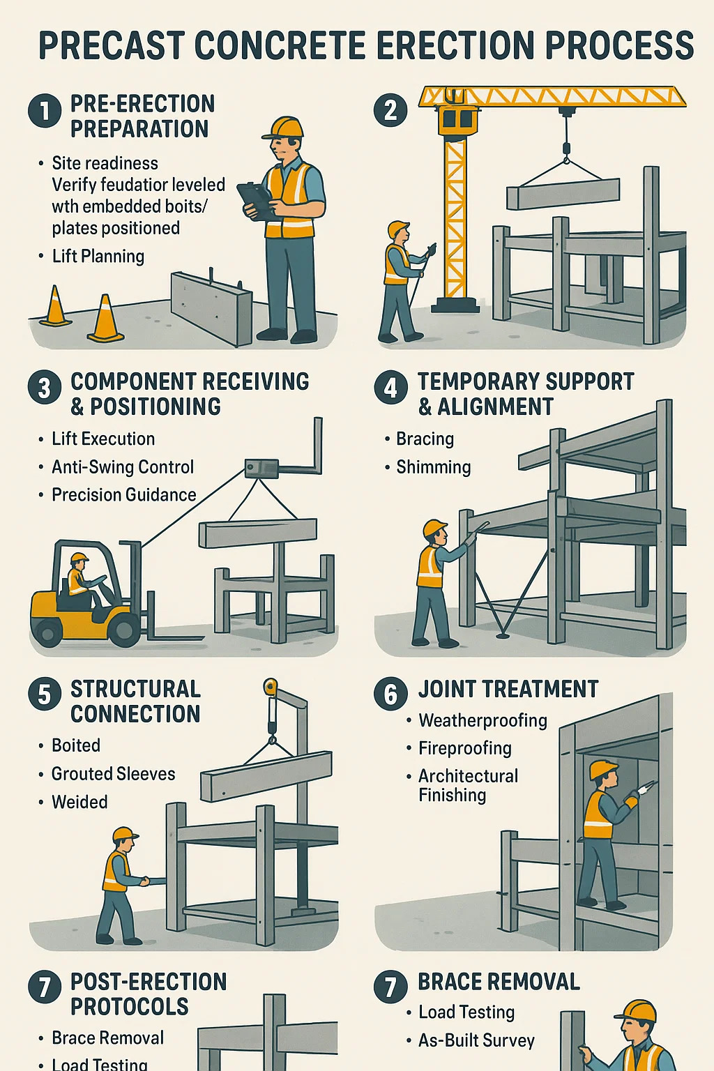 Rigging Setup: Attach slings to lifting inserts cast into the precast elements.